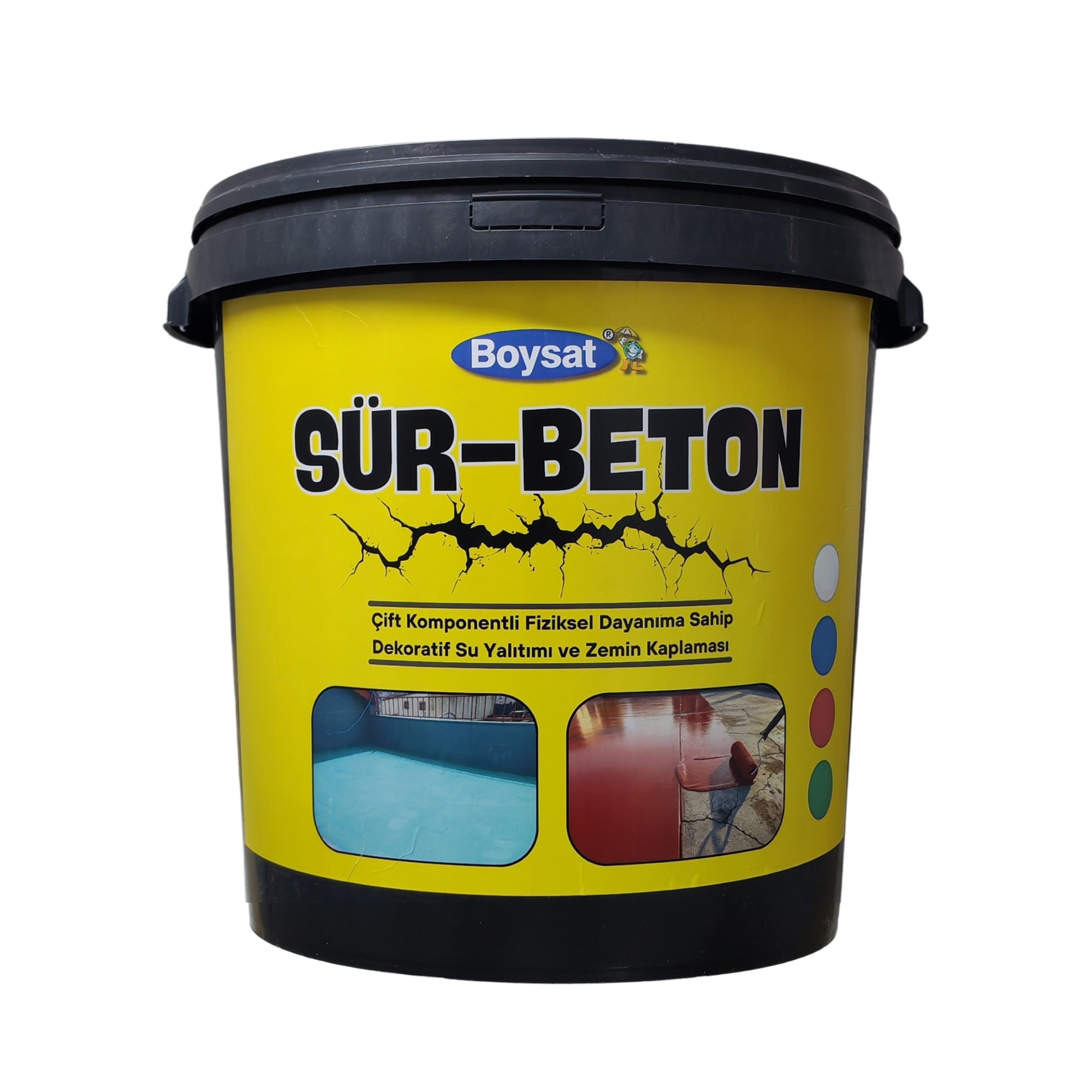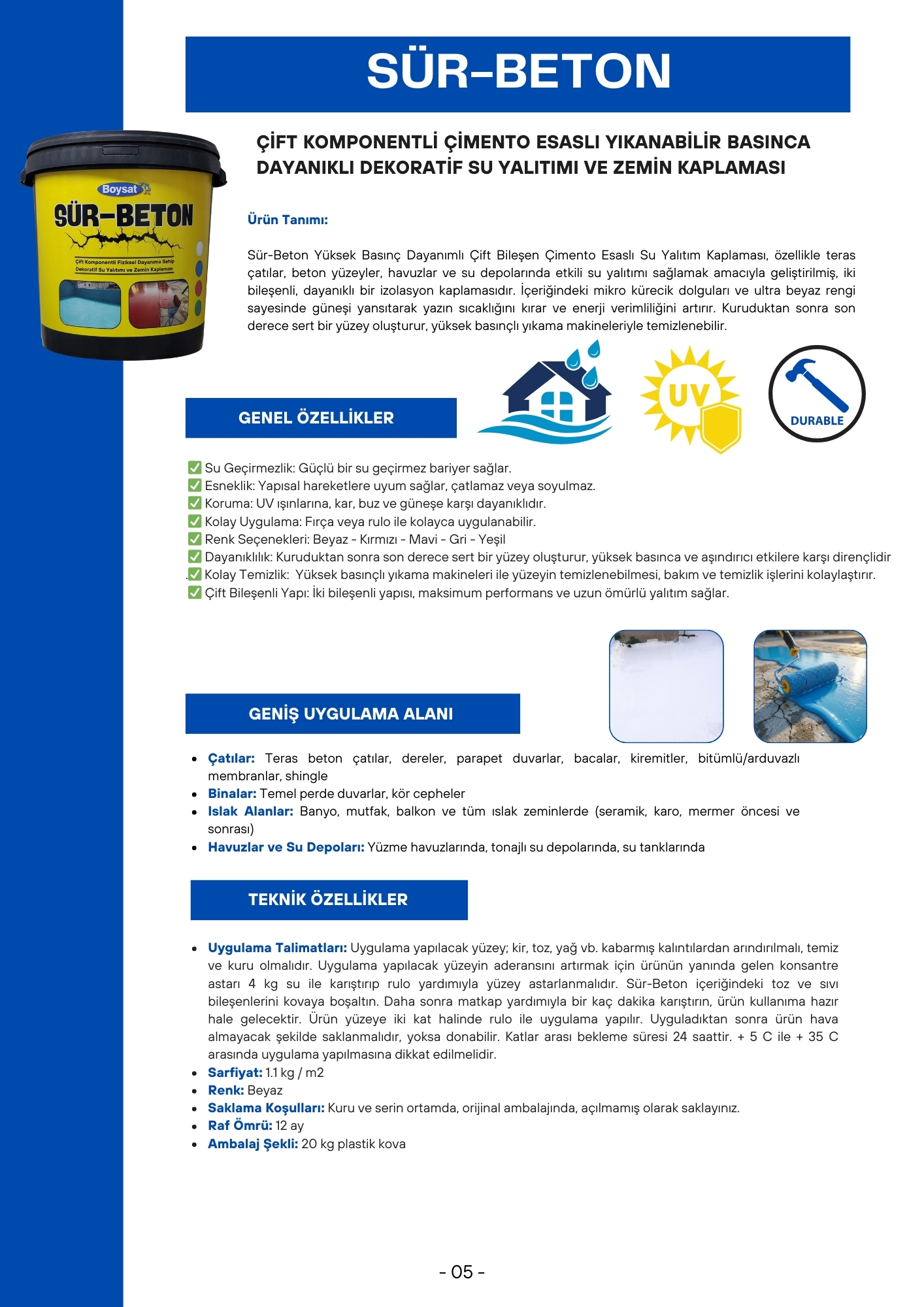 - Uygulama Talimatları: Uygulama yapılacak yüzey; kir, toz, yağ vb. kabarmış kalıntılardan arındırılmalı, temiz ve kuru olmalıdır. Uygulama yapılacak yüzeyin aderansını artırmak için ürünün yanında gelen konsantre astarı 4 kg su ile karıştırıp rulo yardımıyla yüzey astarlanmalıdır. Sür-Beton içeriğindeki toz ve sıvı bileşenlerini kovaya boşaltın. Daha sonra matkap yardımıyla bir kaç dakika karıştırın, ürün kullanıma hazır hale gelecektir. Ürün yüzeye iki kat halinde rulo ile uygulama yapılır. Uyguladıktan sonra ürün hava almayacak şekilde saklanmalıdır, yoksa donabilir. Katlar arası bekleme süresi 24 saattir. + 5 C ile + 35 C arasında uygulama yapılmasına dikkat edilmelidir.